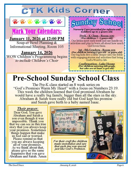 ~ This group will be taken into the Sanctuary during the Children's Message by the Child Care Workers during both services.